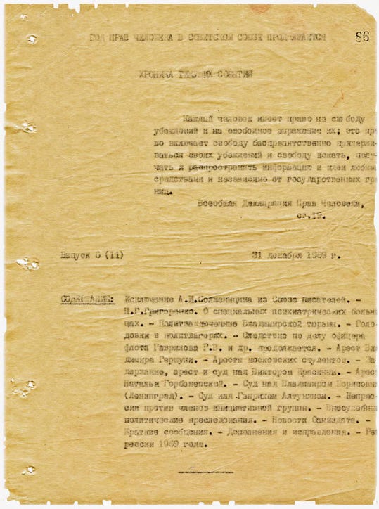 During the15 years it was published, the text was typed out by a volunteer in five carbon copies which were distributed to other free spirits who would type out further carbon copies. Thus news that the state wanted to suppress was circulated. It is no exaggeration to say that the clandestine work of these often-neglected human rights defenders paved the way for the reforms initiated by Mikhail Gorbachev. For more on the Chronicle, read this Wikipedia entry.